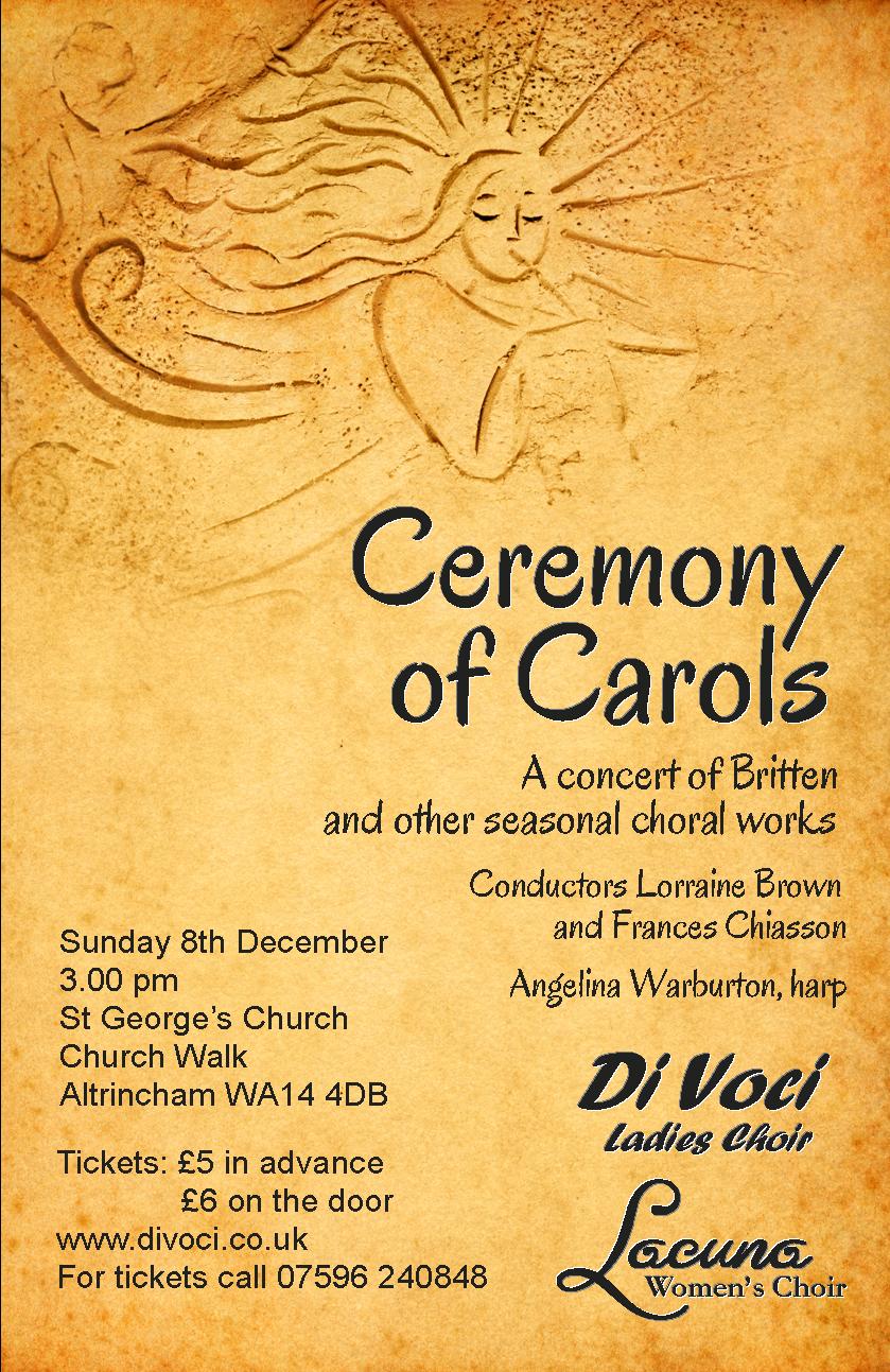 Di Voci are teaming up with Lancaster-based ladies choir Lacuna to perform Benjamin Britten’s gorgeous Christmas work, A Ceremony of Carols. As well as the Britten, there will be a selection of seasonal favourites, so do come along and let Di Voci and Lacuna get you into the Christmas spirit!